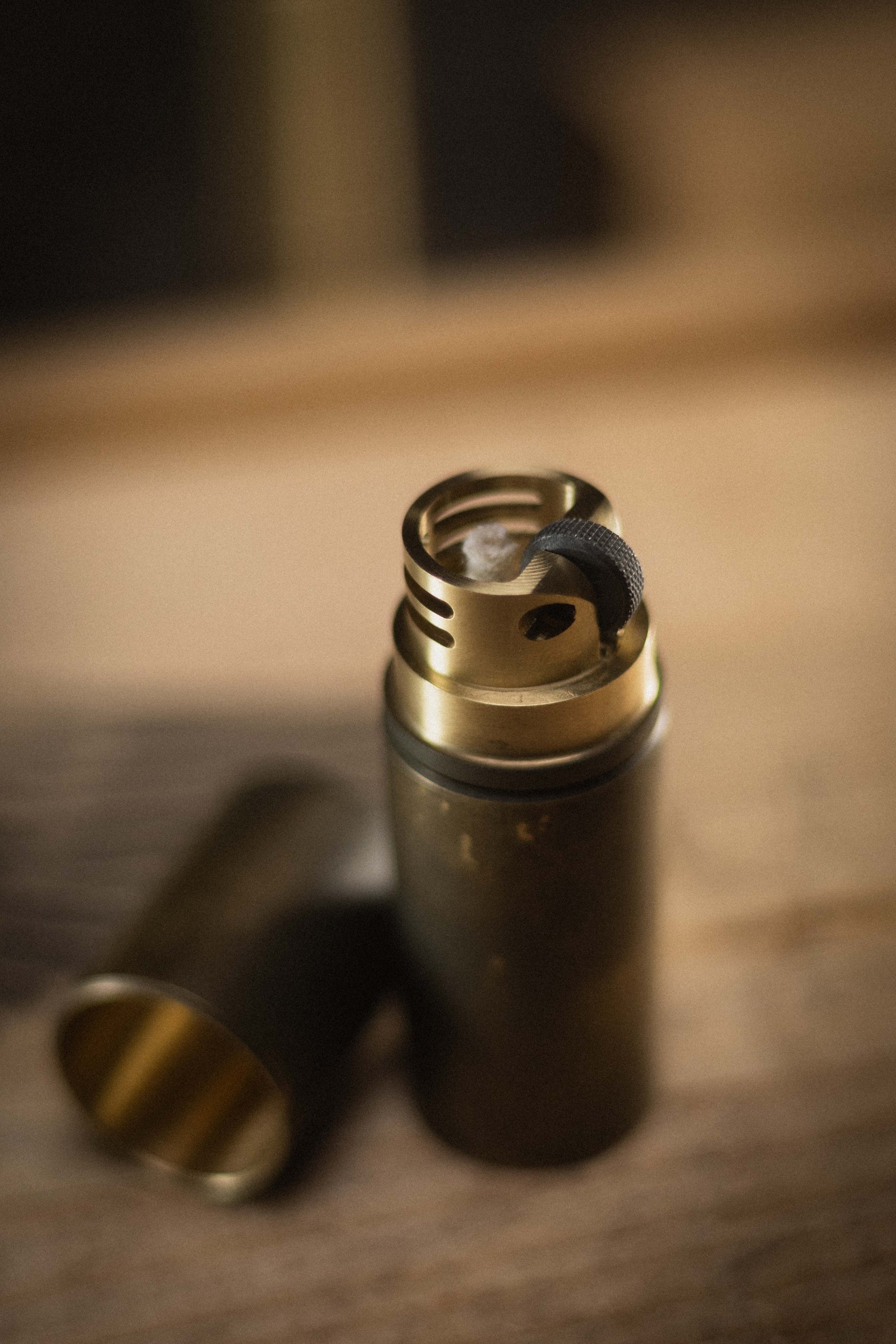 This trench lighter is a patina MONSTER! Machined from solid 1" round brass puts it in a weight class of its own. The brass finish will wear and weather like nothing you've owned before, but if you can't wait, get it with the aged brass finish that has a patina so deep and heavy it feels like it came straight from the trenches of WW1. This lighter uses rare earth magnets attached inside the lid to hold it onto the body and brings a fidget factor that will keep you busy for days on end. Each lighter is individually marked with a serial number on the inside.